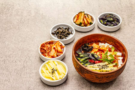 Traditional Korean spicy soup with kimchi, tofu, vegetables. Hot dish for healthy meal. Stone concrete background, copy space
