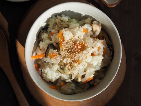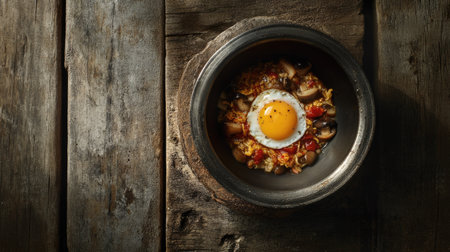 Close up of Bibimbap or Korean rice dish served on wooden table.