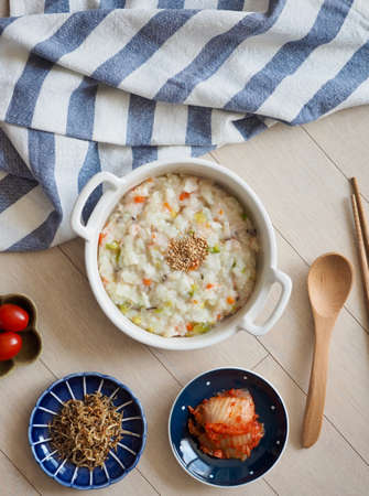 Korean food collection photo_Kimchi White rice in bowl top view Porridge, red soup made of Kimchi with spoon 1