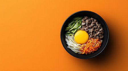 A vibrant and appealing bibimbap bowl featuring fresh vegetables, a sunny-side-up egg, and seasoned beef, set against a bright orange backdrop. Perfect for food photography.