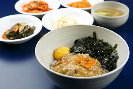 Abalone bibimbap with seaweed soup and side dishes. Korean local food.