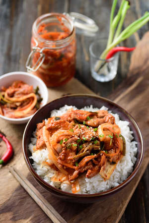 Korean food, Stir- fried kimchi with pork on cooked rice in a bowl with chopsticks on wooden background