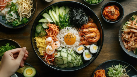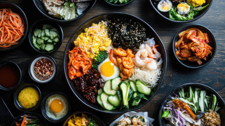 Overhead shot of a Korean feast featuring a variety of dishes like bibimbap, gimbap, and soy sauce shrimp, surrounded by small bowls of vegetable side dishes