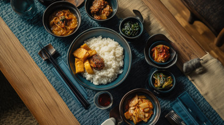 A beautifully arranged Asian meal featuring various rice dishes, fresh vegetables, and herbs, showcasing vibrant colors and delicious flavors for a delightful dining experience.