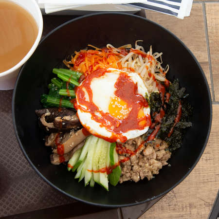 Bibimbap - Korean food with fried egg, vegetables and mushrooms