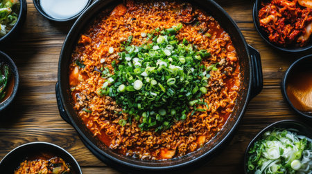 A steaming hot pot filled with spicy broth, fresh vegetables, and noodles. Perfect for sharing among friends or family, this dish brings warmth and flavor to the dining table.
