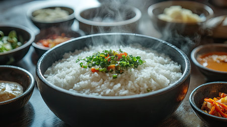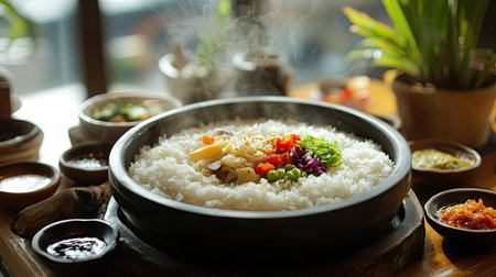 A steaming bowl of rice surrounded by small plates of sauces and vegetables in an authentic dining setup.