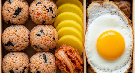 Korean-style lunch box with bibimbap ingredients, kimchi and pickled radish. Container with dosirak. Everyday lunch boxes.