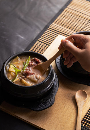 Homemade delicious dumpling Soup with seaweed egg drop soup in white bowl eat with kimbub. Asian food