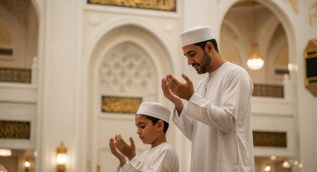 Muslim father and son in white thobes and prayer caps praying with hands raised in a mosque. depicts devotion, family, and islamic tradition.