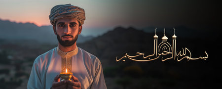Handsome Muslim man holding lit candle in front of mosque in the evening