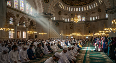 A large group of Muslims gather in a mosque for prayer, a serene and spiritual moment of unity and devotion. The image captures the essence of faith and the importance of community in Islam.