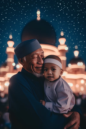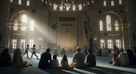 Muslim family celebrating Eid al-Adha Mubarak in the mosque.
