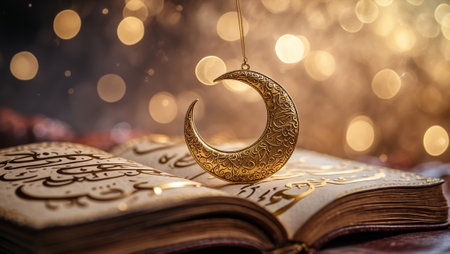 Elegant crescent moon pendant hanging over an open book with intricate calligraphy and soft glowing lights