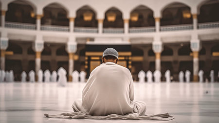 photograph of a Muslim pilgrim sitting in a mosque while dressed for the Hajj. GENERATE AI