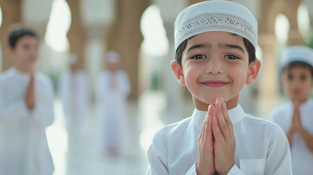 Smiling Middle Eastern boy celebrating Ramadan traditions with friends at mosque. Concept of cultural heritage, joy, spirituality, community, childhood happiness. Copy space.