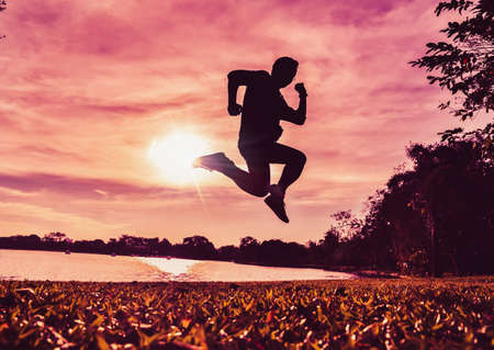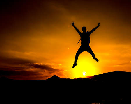 One man is jumping in the air, he is very happy in life with sunset as background.Silhouette image