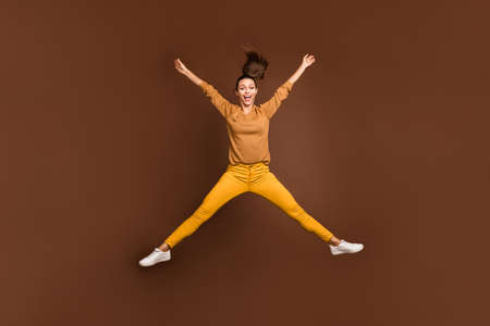 Full length body size photo of cheerful positive cute nice sweet pretty girl expressing overjoying emotions jumping in star shape isolated over brown pastel color background