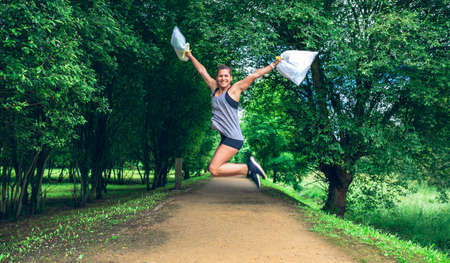 Picture of cheerful fat woman leaping on the road with sunlight background
