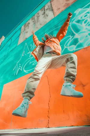 A man in an orange jacket is jumping in the air in front of a colorful wall. Concept of freedom and joy, as the man is enjoying himself while performing the jump. The vibrant colors of the wall