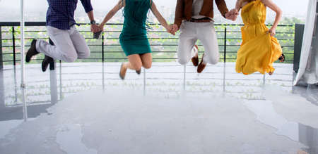 Backview of two girls in the air with hands clasped. Brunette women jumping in the air and holding hands with city view.