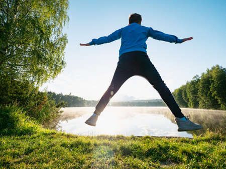Funny boy jumping outdoor at lake gainst to sunset. Adolescent boy in blue sweatshirt and white sneakers