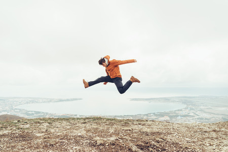Trekking concept. Spontaneous brave person jumps in the air after seeing amazing mountain view. Happiness after physical activity. . High quality photo