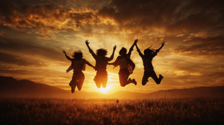 A group of friends jumping in unison, their silhouettes captured against a colorful sky