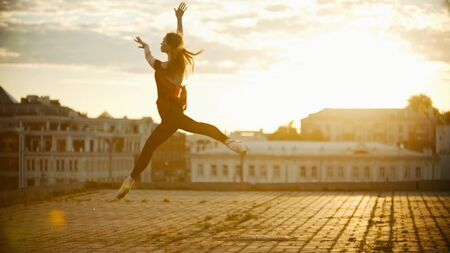 Young graceful woman ballerina dancing and jumping on the roof - bright sunset