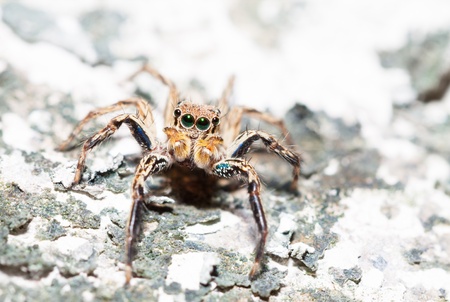 Amazing jumping spider action on a birch peel. Beautiful nature scene with hairy arachnid who has big shining eyes