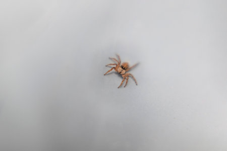 Jumping spider (Icius subinermis) female on white background, Italy.
