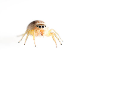 Close up of Pantropical Jumper also known as Hong Kong Spiders isolated on white background and vignette. Object with some outfocused or motion blur due to capture by macro lens.