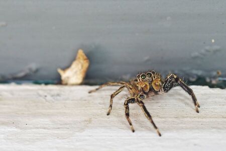 Jumping spider of the family Salticidae on the balcony of a house in macro
