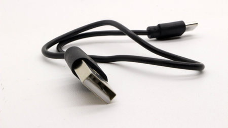 Hand showing USB cable on white surface. Perfect for technology, connection, charging, gadgets and digital communication concepts.