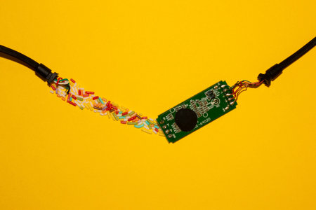 creatively cut cable connected to the motherboard with colorful decorative sugar concept of combining technologies and colors on a yellow background