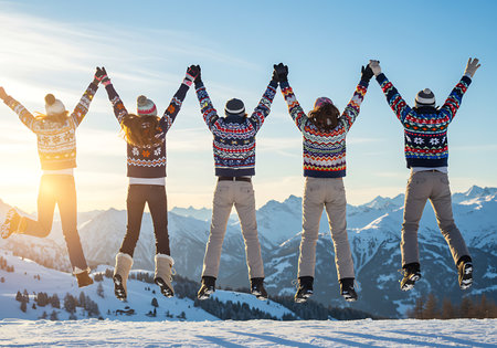 Four friends are jumping in the air with their arms raised, enjoying a winter adventure in a snowy mountain setting. Generative Ai