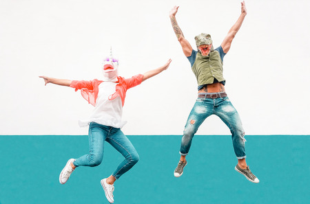 Happy seniors crazy couple wearing unicorn and t-rex mask while jumping outdoor - Mature trendy people having fun celebrating outside - Absurd concept of masquerade funny holidays