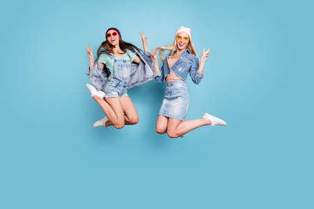 Full length body size view of nice-looking attractive lovely fascinating cheerful cheery crazy overjoyed girls having fun isolated over bright vivid shine blue green turquoise background
