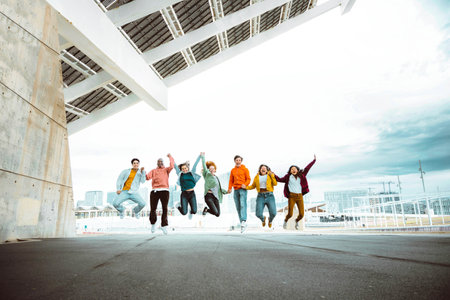 Generative AI : Happy group of young people jumping on city street Multiracial students college celebrating outside Life style concept with guys and girls having fun together han