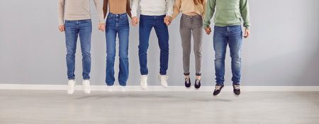 Legs close up people wearing jeans in jump movement, group hands holding close. Friends jumping in trousers denim garment pants, casual wardrobe, fashion clothing, diverse team in unity together