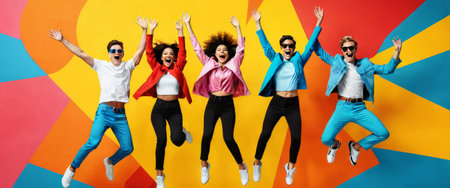 Diverse group of people jumping joyfully against colorful backgrounds