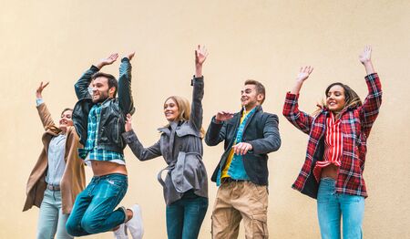 Happy friends millennials jumping against brick wall - Friendship lifestyle and team concept with young millenial peoplehaving fun together - LIfe goals and everyday inspiration on warm vivid filter