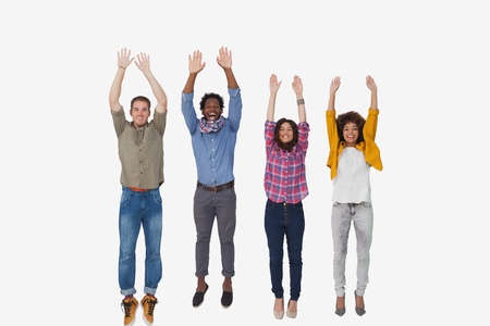 Four stylish friends smiling at the camera and jumping on white background