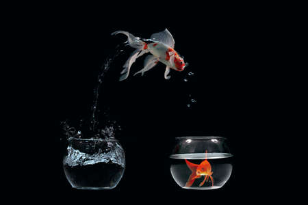 Goldfish jumping out from one small glass cup to another bigger fishbowl aquarium with clear water on dark gray background with vignette. Looking for new opportunities or better life poster concept