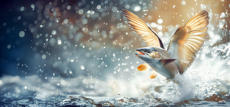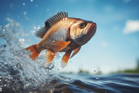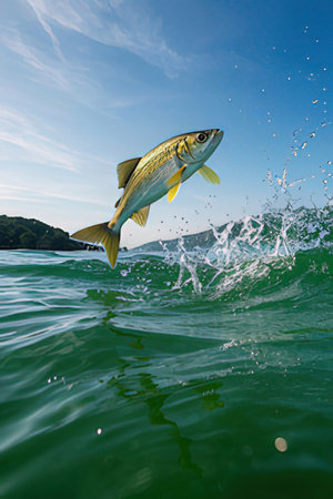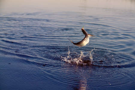 Fish jumping out of the water on a background of the blue sky