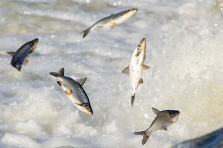 Fishes go for spawning upstream. Vimba jumps over waterfall on the Venta River, Kuldiga, Latvia.