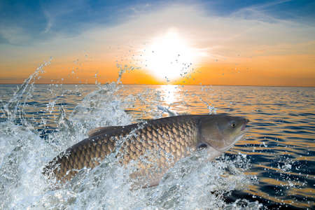 Amur or grass carp fish jumping with splashing in water