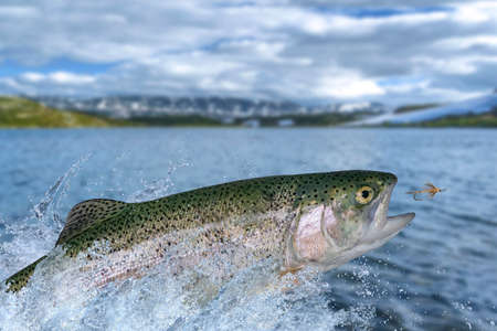 Fly fishing. Rainbow trout fish jumping for catching synthetic insect with splashing in water