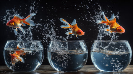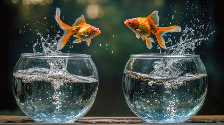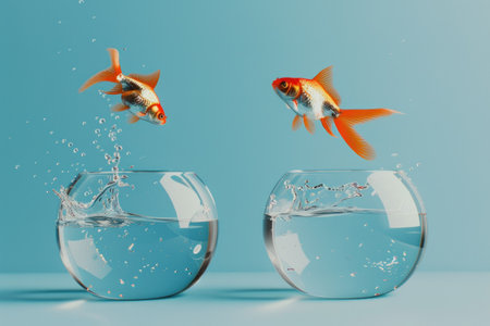 Goldfish jumping out of glass bowl into another one against light blue gradient background