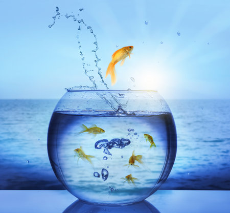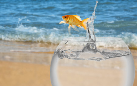 Goldfish jumping out of glass fish bowl into sea outdoors